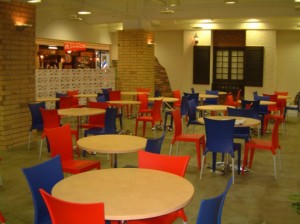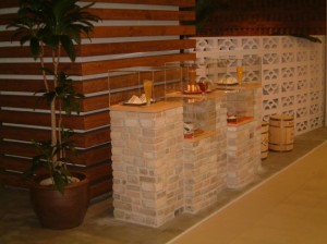 レンガの素地と白く塗った穴あきブロックをうまく配置し空間を間仕切り、赤と青のイスとともに、イタリアのカフェを思わせるイメージ。 白い壁にある装飾窓がポイント。