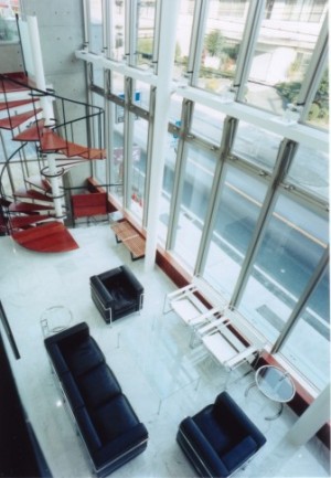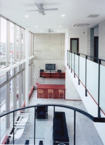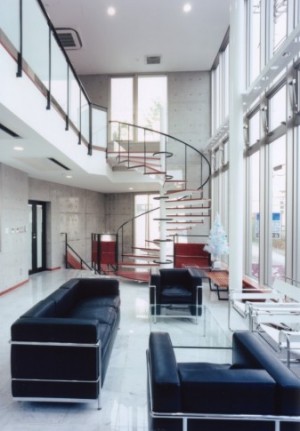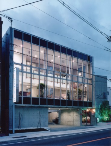 敷地を最大限利用できるようにするため、敷地の形をふちどるかのように計画された平面により、道路に面する東側はカーテンウォールのタテとヨコのラインによるスマートな外観。