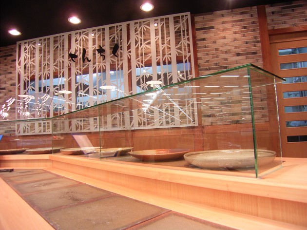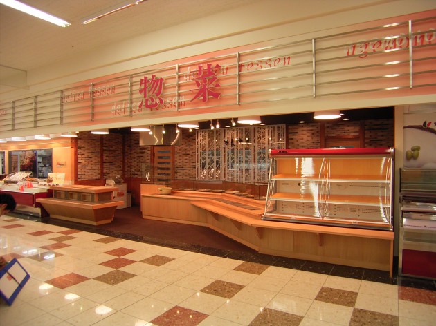 スーパー内の惣菜店。 むかしのおくどさんをモザイクタイルで表現したディスプレイ台や、お客様の動線を意識したディスプレイの配置にしました。